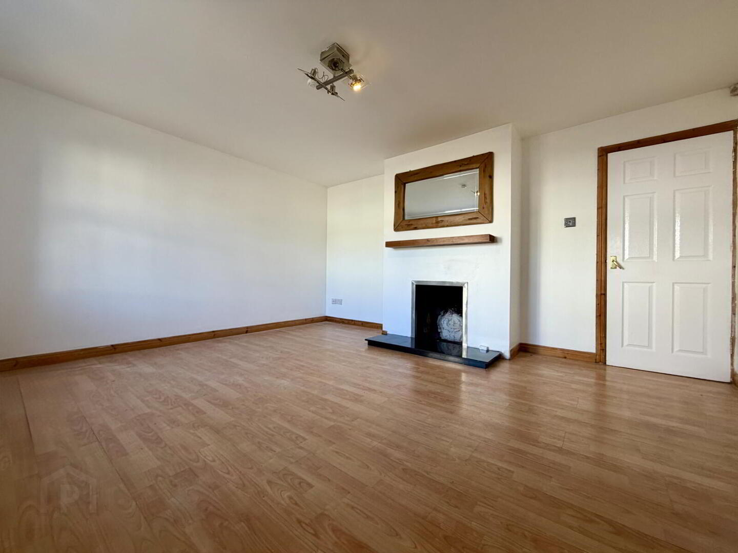 Laminate flooring with single radiator and PVC front door.
