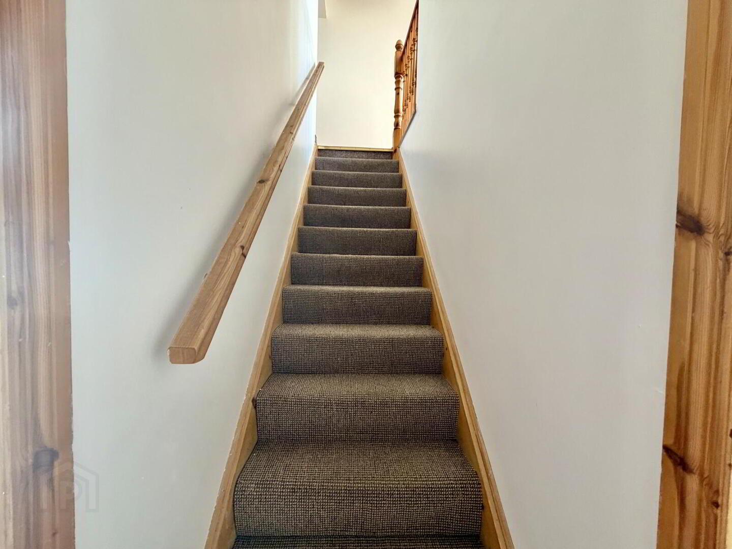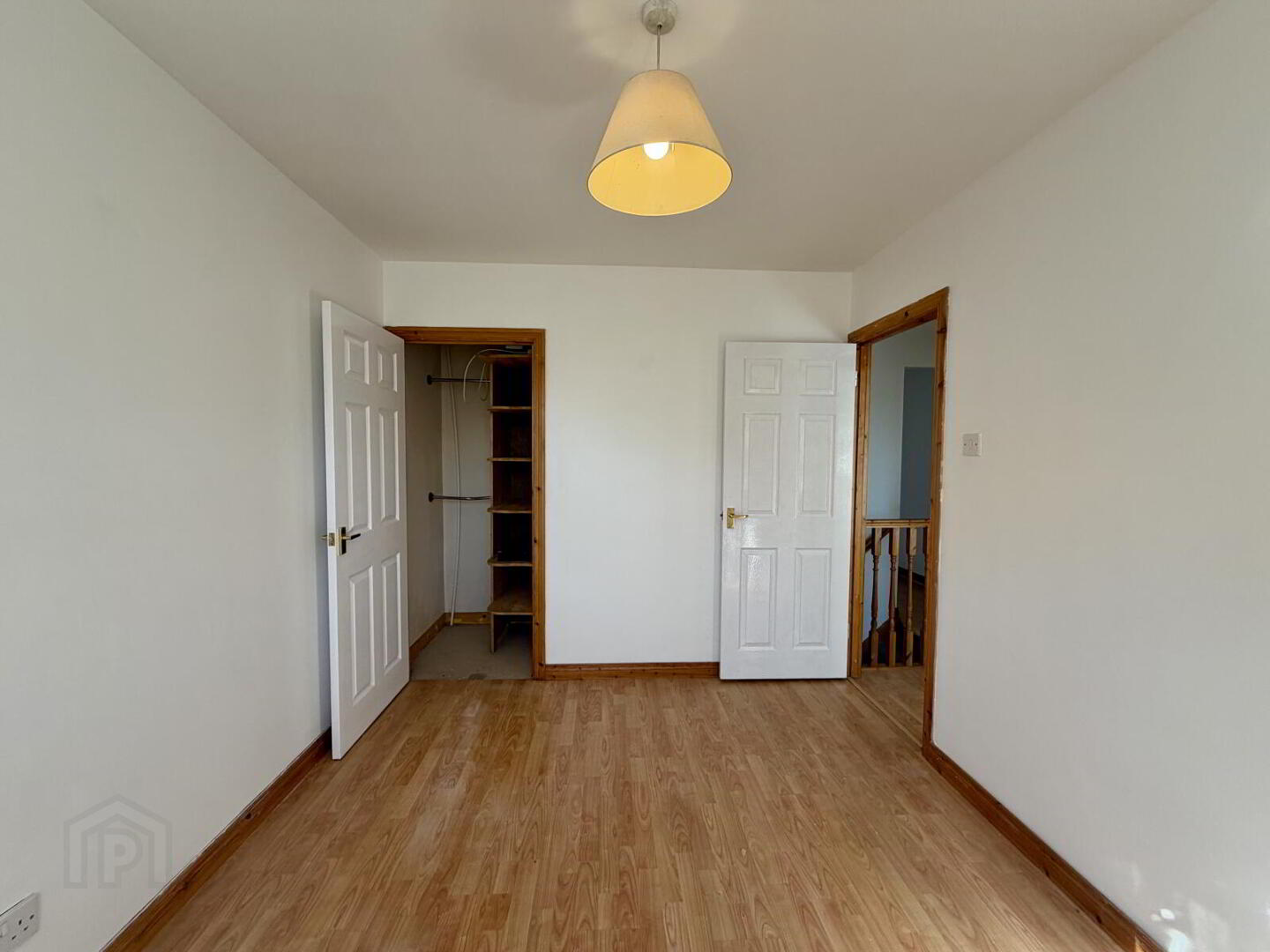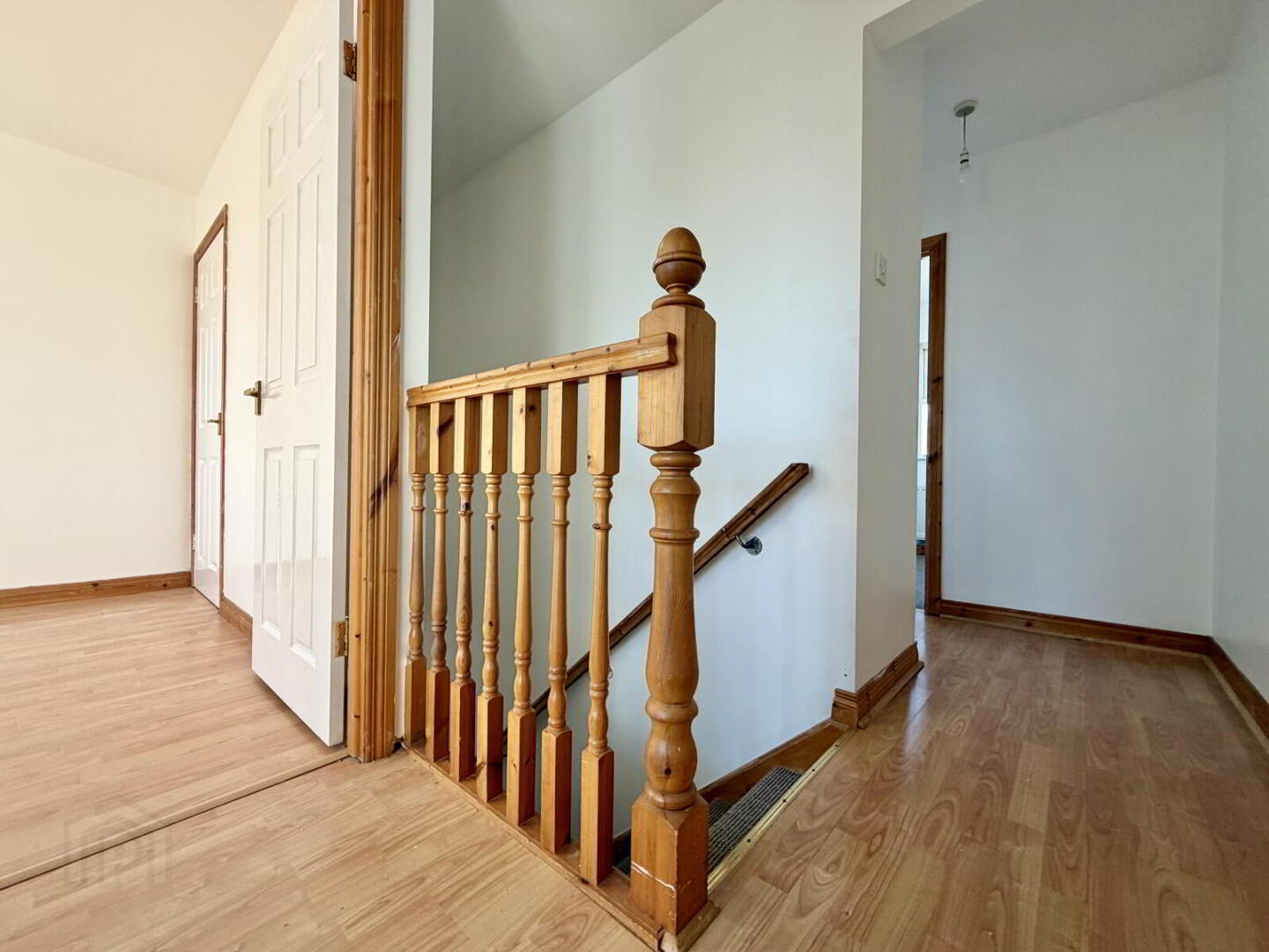 Laminate flooring with wooden spindle staircase. Hot press with shelving for linen and towels.