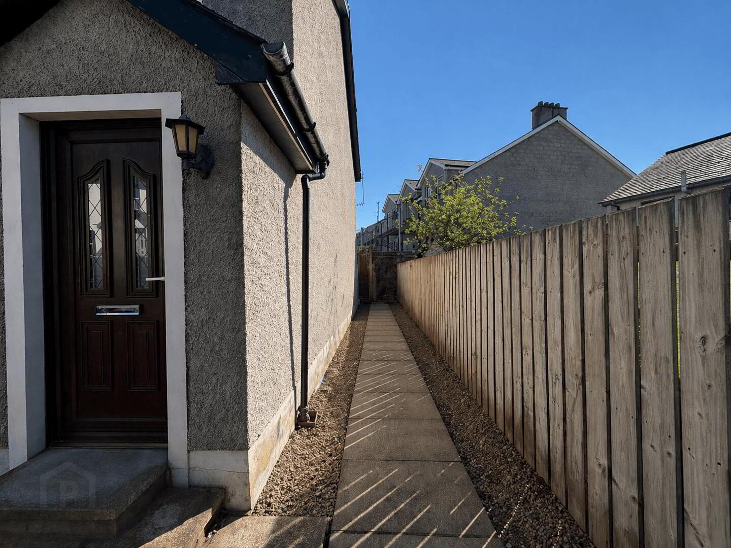 Front garden laid in stone with partially paved area and step leading to the front entrance. Rear alleyway fully paved with sandstone finish to one side, providing access around the property.