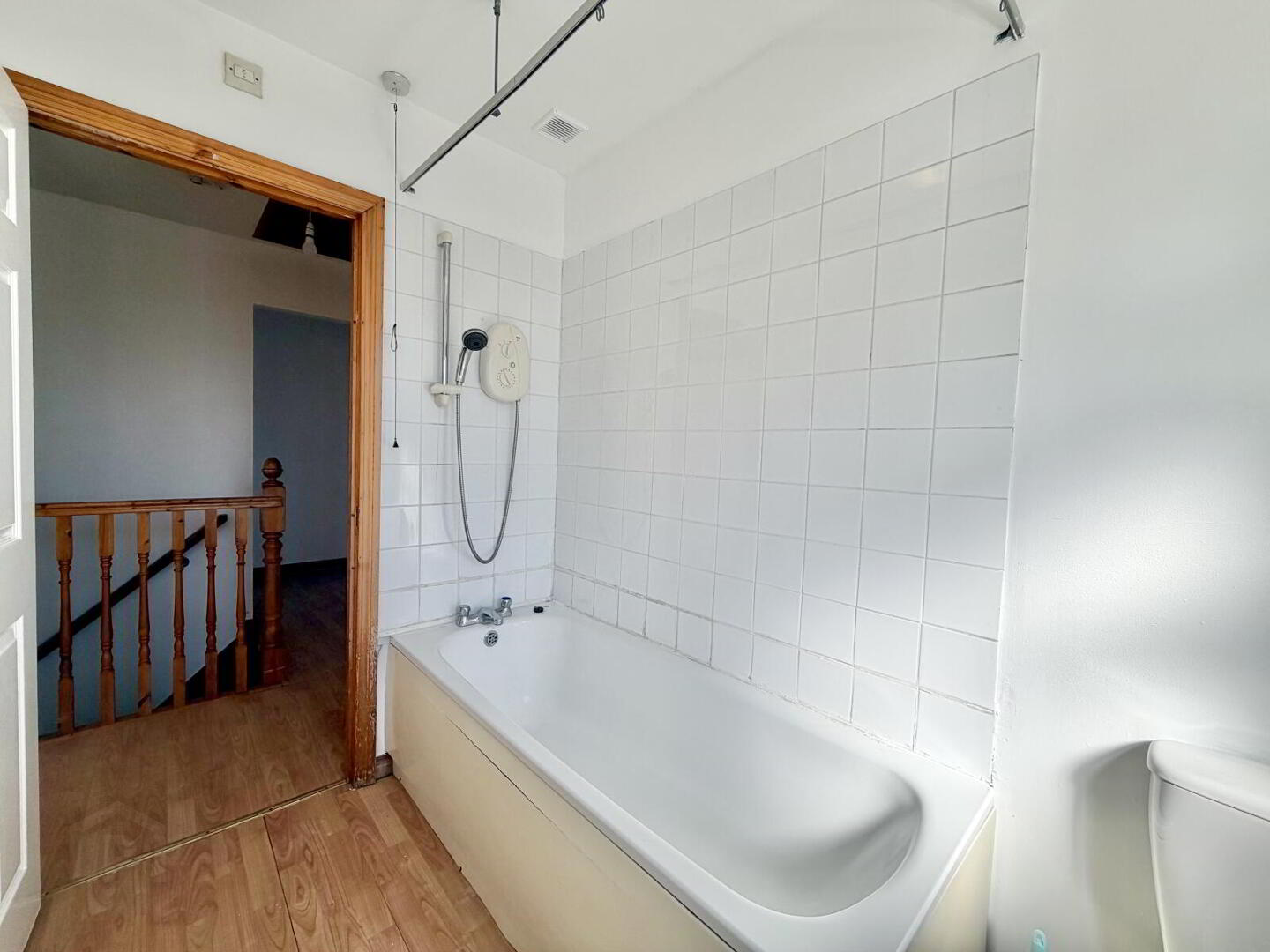 Laminate flooring with single radiator. White suite comprising bath, toilet and wash hand basin. Electric shower with tiling around bath and shower area.