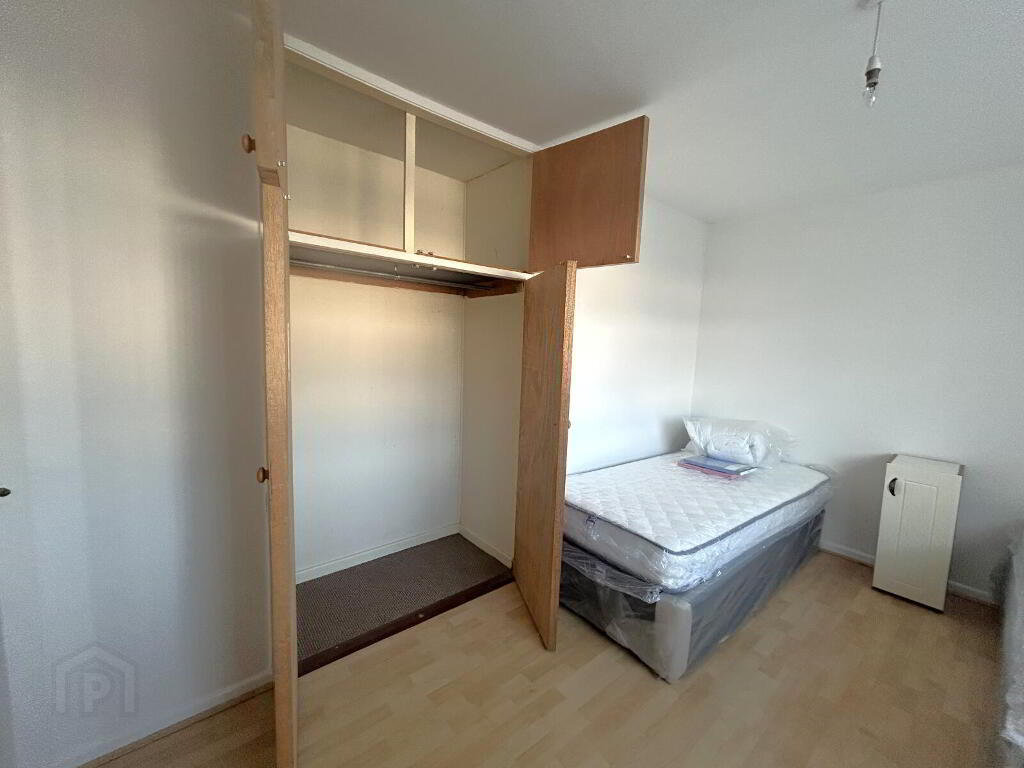 Double bedroom with wooden laminate flooring and single radiator. Built-in double wardrobe with silver hanging rail and two overhead storage cupboards.