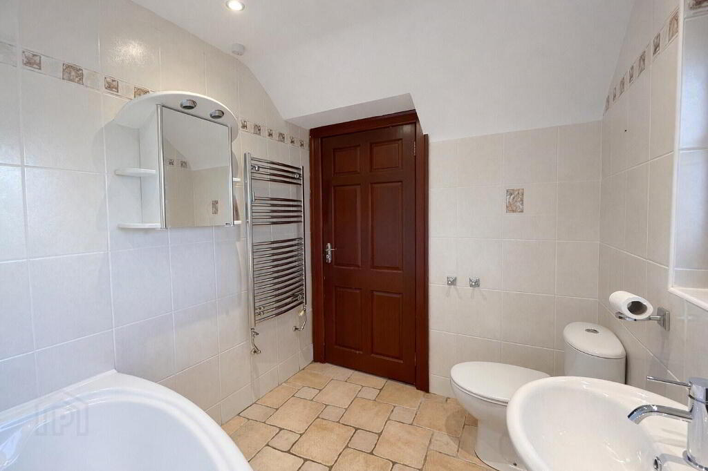 Fully tiled bathroom with floor-to-ceiling wall tiling and tiled flooring. Features a P-shaped bath, white sink and WC, stainless steel heated towel rail and modern spotlight lighting.
