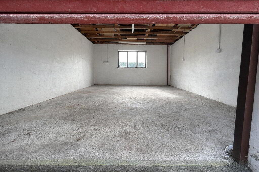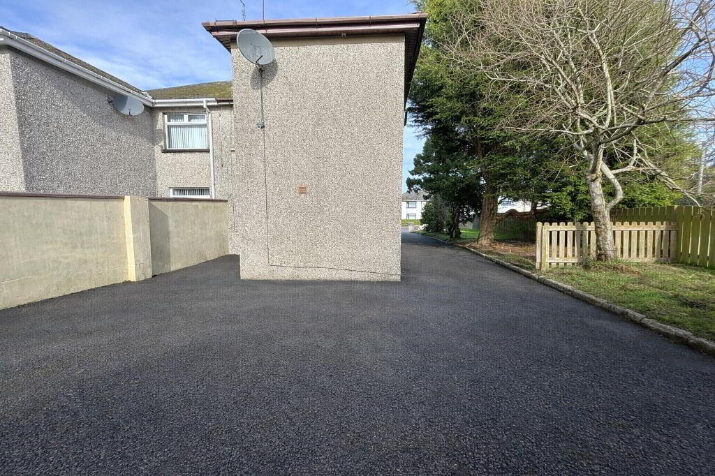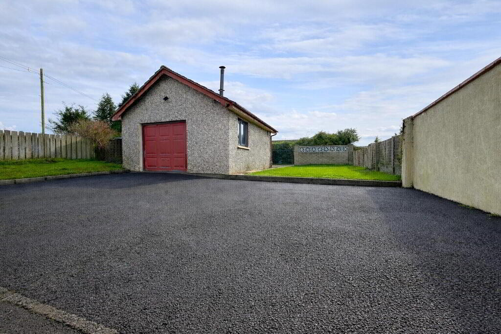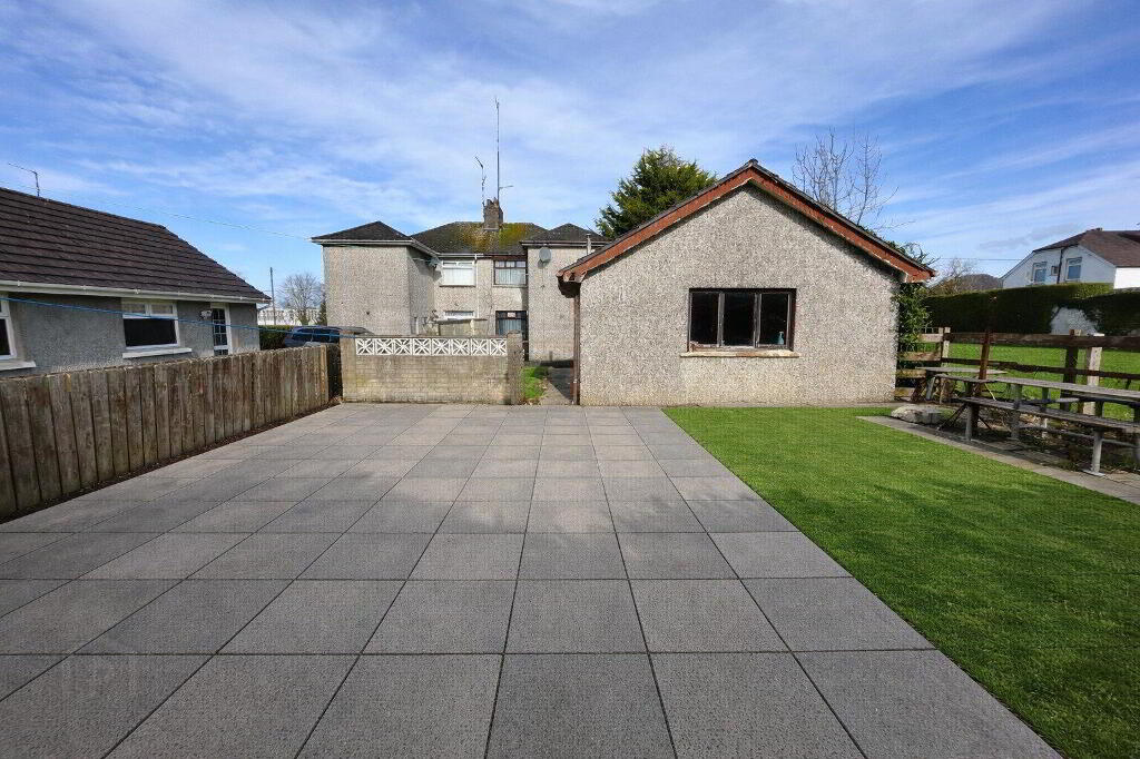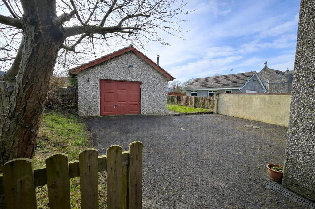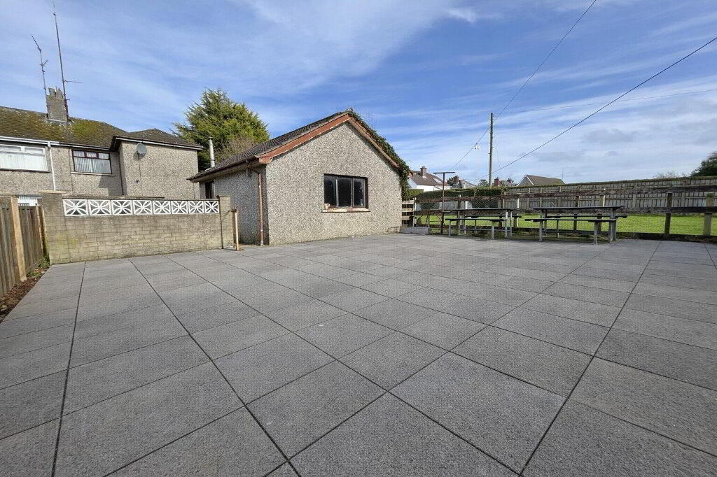 To the rear of the property there is a garage along with additional garden space. A dividing wall separates a further lawned garden area which leads to a spacious private garden at the back. This area is finished with concrete paving stones and is enclosed by wooden fencing, creating a private outdoor space ideal for relaxing or entertaining.