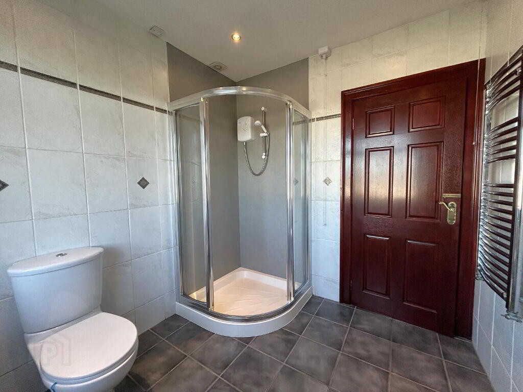 Spacious first-floor bathroom featuring a walk-in shower, white sink and white WC. The room includes a stainless steel heated towel rail, tiled flooring and partially tiled walls with plaster finish above the shower area.