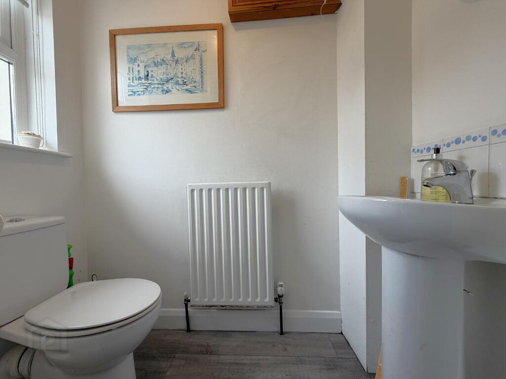 White WC and sink with grey flooring and radiator.
